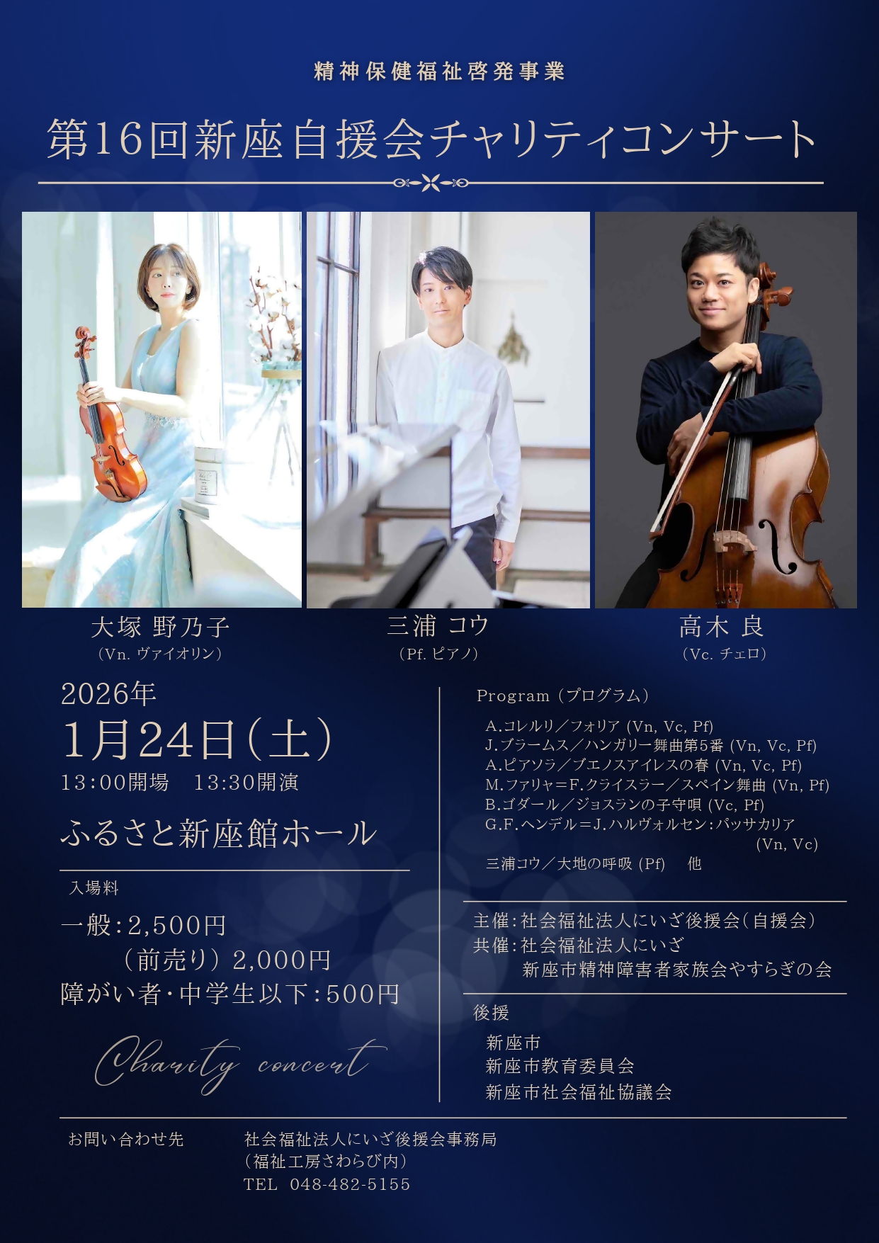室内楽やオーケストラ等での演奏活動や後進への指導を積極的に展開しているヴァイオリニスト大塚野乃子氏、“想いを形にするピアニスト”三浦コウ氏、そして、東京藝術大学器楽科を卒業後、「ディズニー・オン・クラッシック」など様々なオーケストラ、室内楽、レコーディング等に参加されているチェロ奏者高木良氏によるコンサートです。
