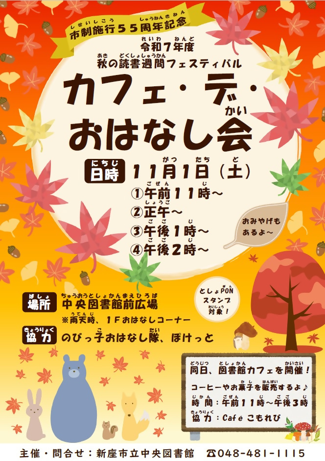 【11月1日】市制施行55周年記念・秋の読書週間フェスティバル 図書館カフェオープン!としょPON対象のおはなし会もやるよ!