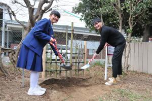 ふくしまサクラモリプロジェクトが福島県で育てた桜の苗木が新座市観光親善大使の黄川田将也さんを通じて母校に贈られ、3月7日(火曜日)にその植樹式を行いました。